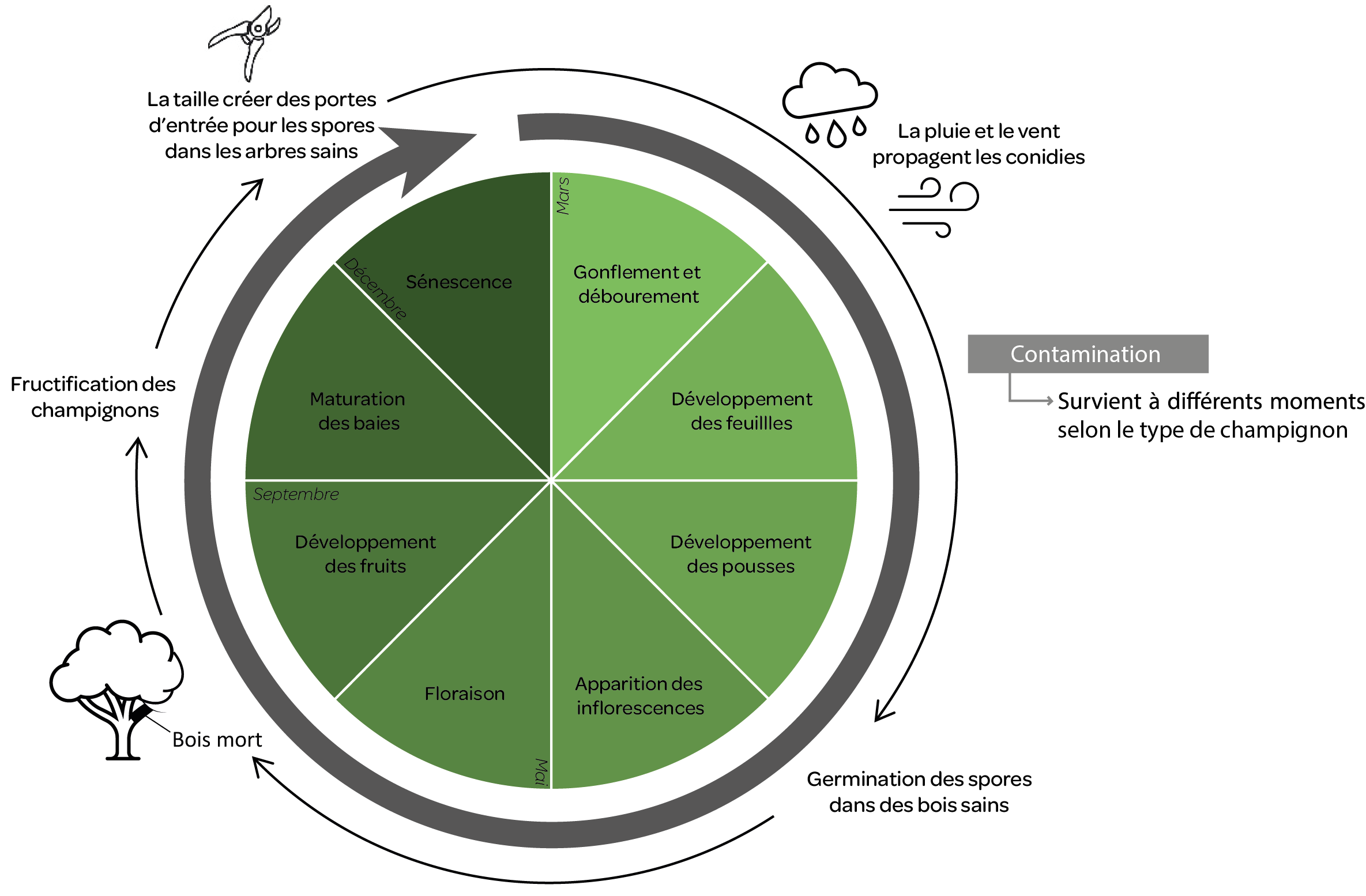 • P. chlamydospora : les conidies issues des pycnides vont pénétrer dans l'arbre par les plaies de taille pendant l'hiver, lors de périodes climatiques douces et pluvieuses. Une fois dans le plant, il colonise rapidement les tissus présents.