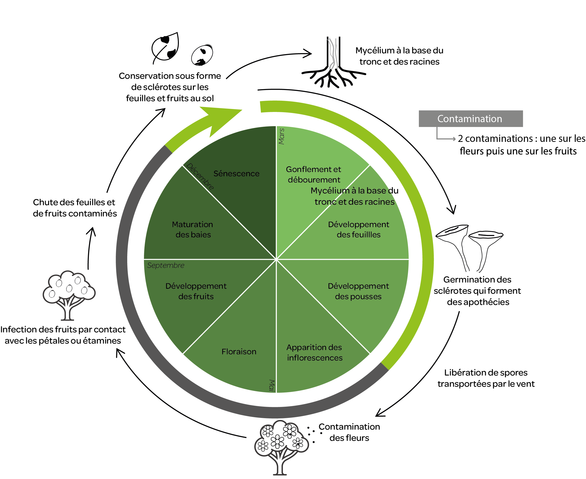 Les apothécies (organes reproducteurs) se forment si le temps est humide pendant au moins 10 jours. Elles libèrent des spores qui transportées par le vent, contaminent les fleurs femelles. Les grappes de fleurs dégénèrent en grappes molles et humides de fleurs brunes. L’humidité des fleurs pendant plusieurs heures permet cette infection, et une fois celle-ci établie, le champignon se propage à d’autres organes sains par simple contact (sur les fruits par exemple). Les sclérotes peuvent également germer directement et former un mycélium (sans former d’apothécies) qui va s’attaquer aux racines et la base du tronc.