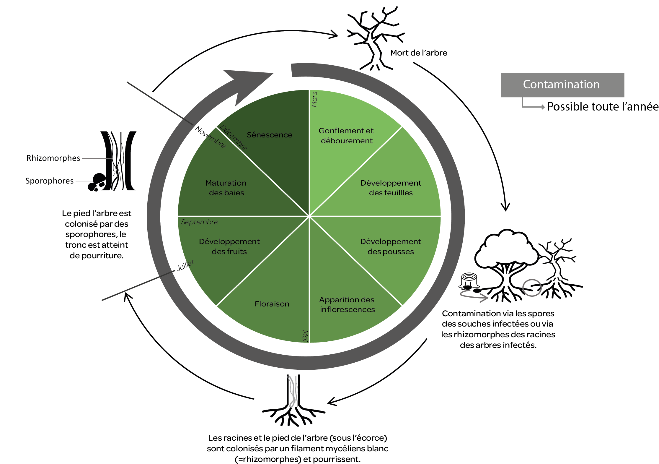 L’infection commence lorsque les filaments du champignon envahissent les racines saines de cet arbre. Elle va ensuite se transmettre au tronc en passant par le collet et attaquer l’aubier entrainant sa pourriture ce qui conduit à la mort de l’arbre.
