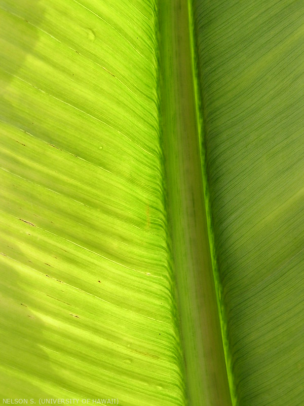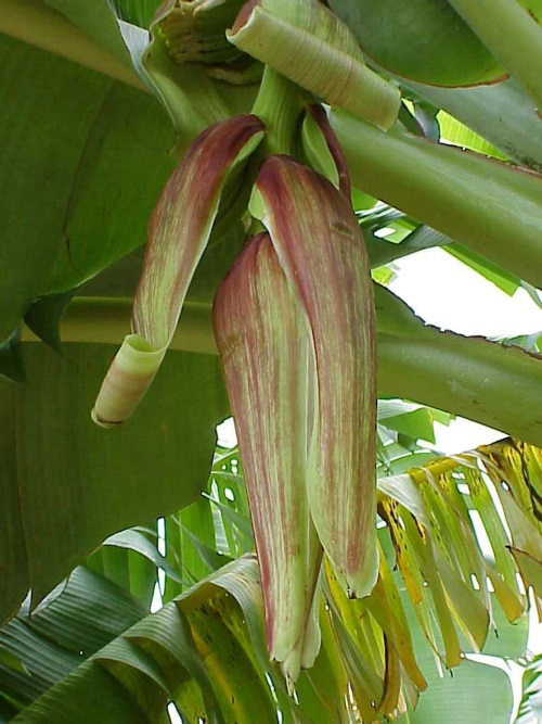 - Les plants infectés ne produisent pas de régime ; en cas de contamination tardive, les bractées de la fleur mâle sont marquées de striures vert foncé, les fruits sont déformés et de petite taille