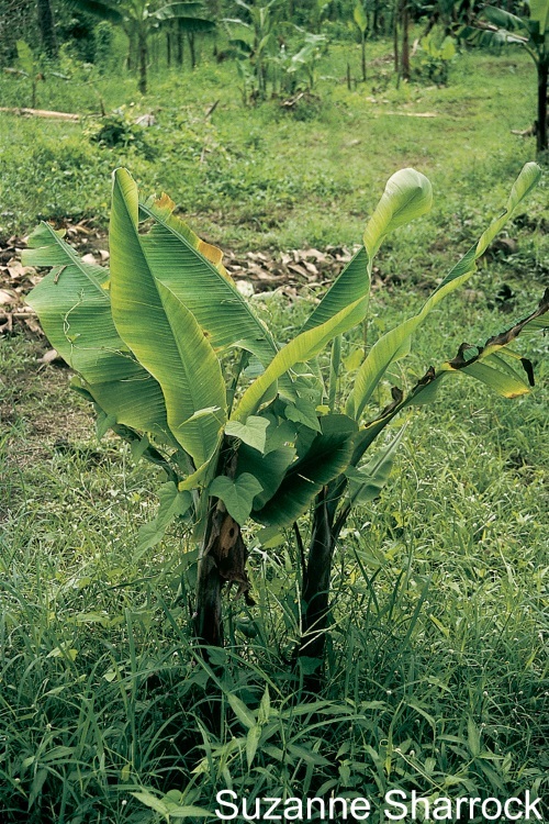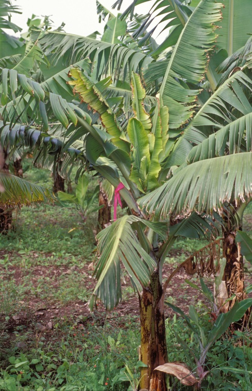 - Rejets affectés dès les premières feuilles émises, avec un nanisme des plants (les touffes de bananiers pouvant avoir la hauteur d’une plantation de poireaux)
