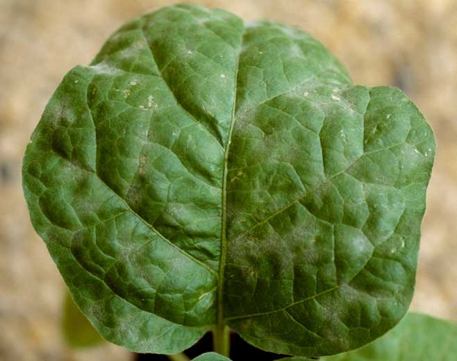 Taches poudreuses et blanches plutôt localisées à la face supérieure des folioles de tomate (figure).