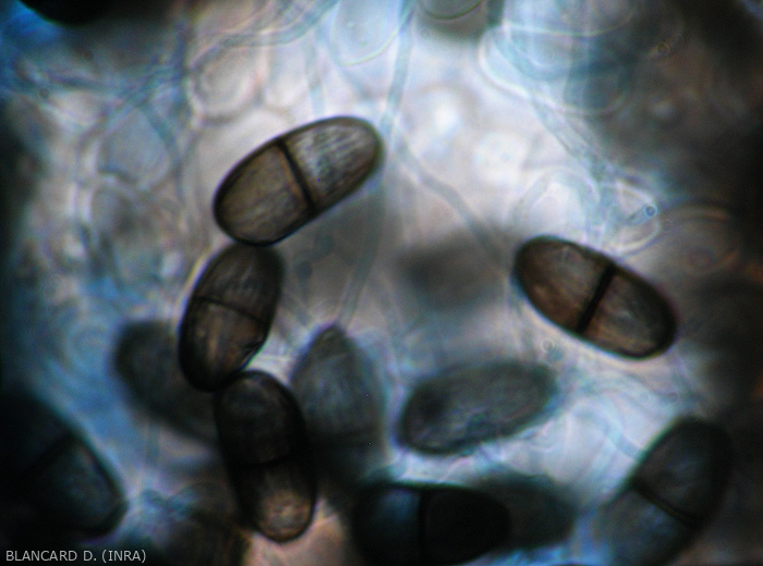 Les conidies de Lasiodiplodia theobromae sont d'abord hyalines et non cloisonnées, et deviennent brun sombre, disposant d'une cloison et de striations irrégulières longitudinales. (anamorphe de Botryosphaeria rhodina)