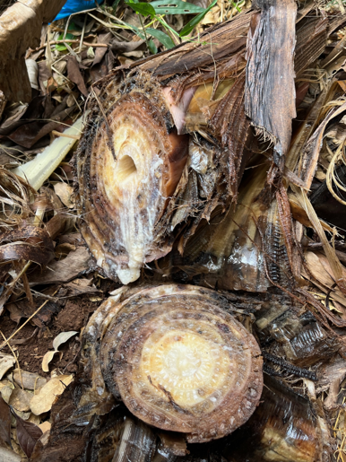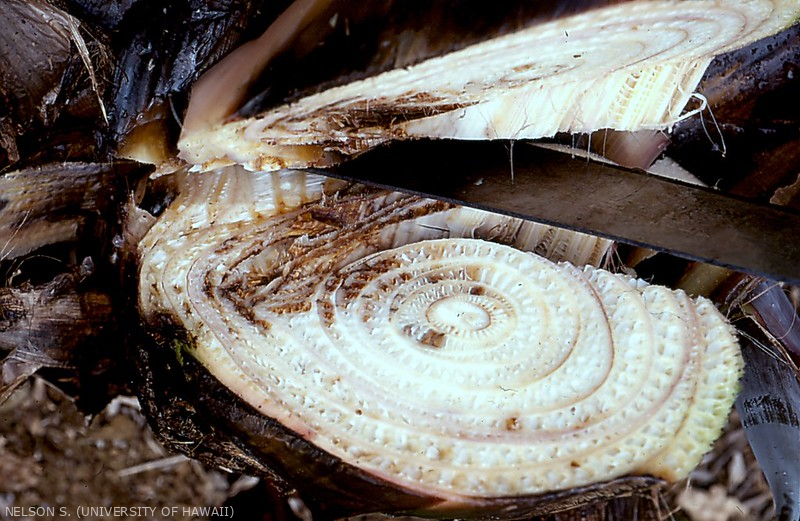 - Au milieu du pseudotronc : présence de zones brunes et molles caractérisées par un écoulement brun et nauséabond lorsqu'on appuye sur les zones atteintes.