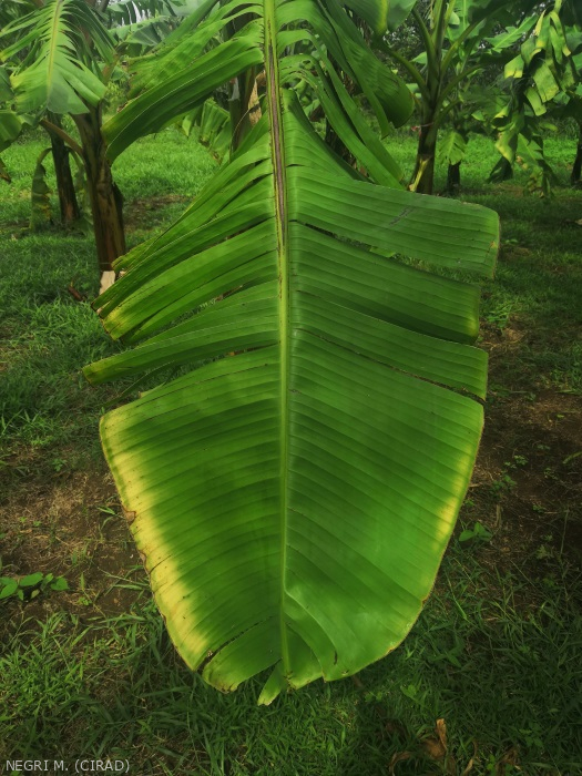 Feuilles : nécroses en bordure sans jaunissement préalable. Feuillage vert foncé tirant vers le bleu ou le bronze. Pseudo-tronc : : aspect fripé, des rejets au stade feuilles lancéolées. |