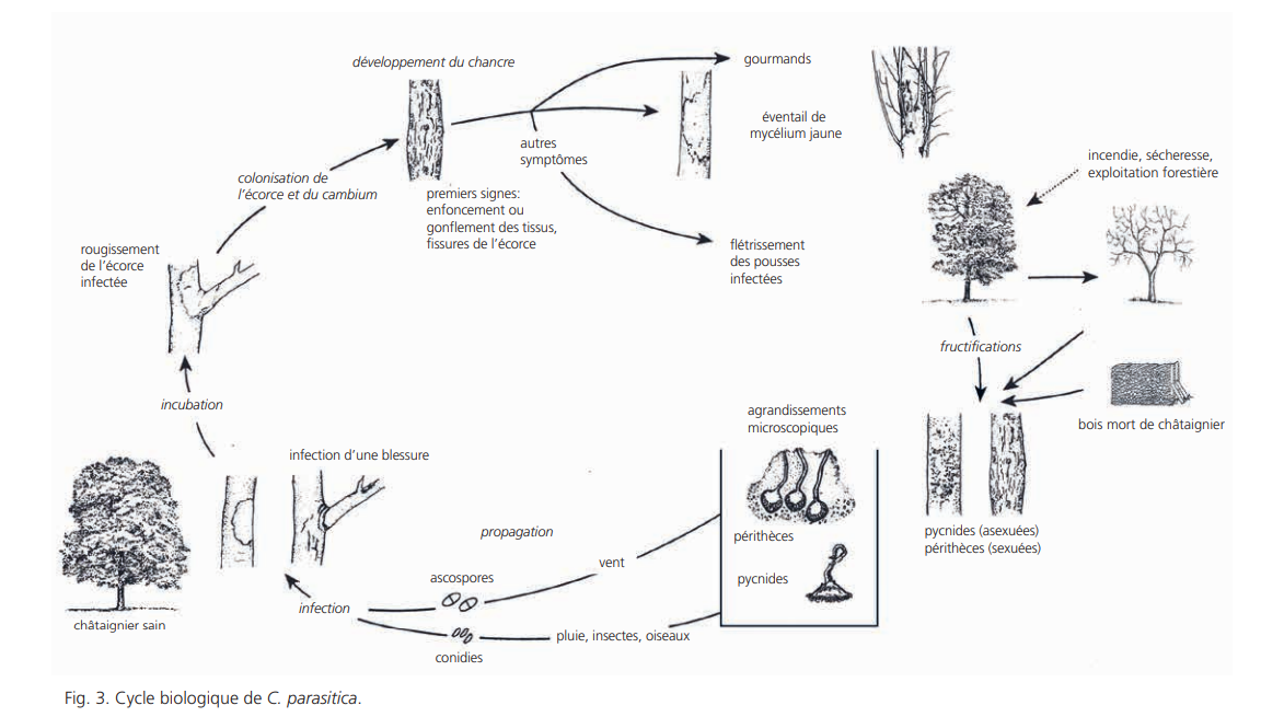 L’infection se fait par dissémination de spores par l’eau de pluie, le vent ou encore des insectes et des oiseaux. Lorsqu’une spore atteint un arbre blessé (branche cassée, blessure de coupe, …), cet Ascomycète va se développer dans l’écorce et le cambium jusqu’à détruire les tissus conducteurs, entrainant le dépérissement de la partie située au-dessus de l’infection du chancre (cycle en Figure 1).