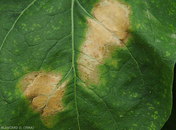 • Lésions nécrotiques allongées et étendues sur les feuilles.