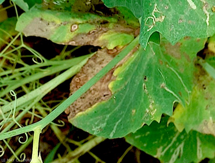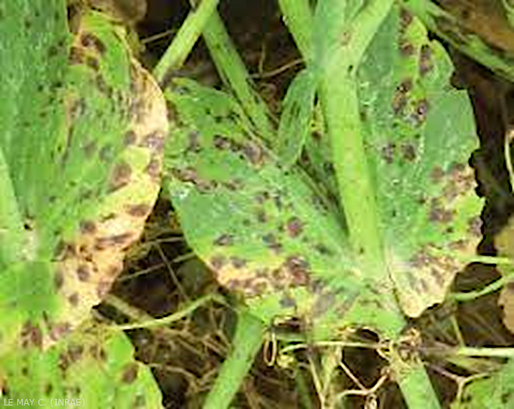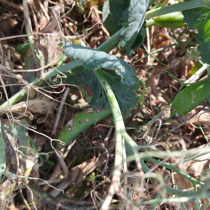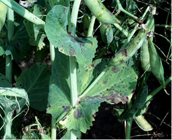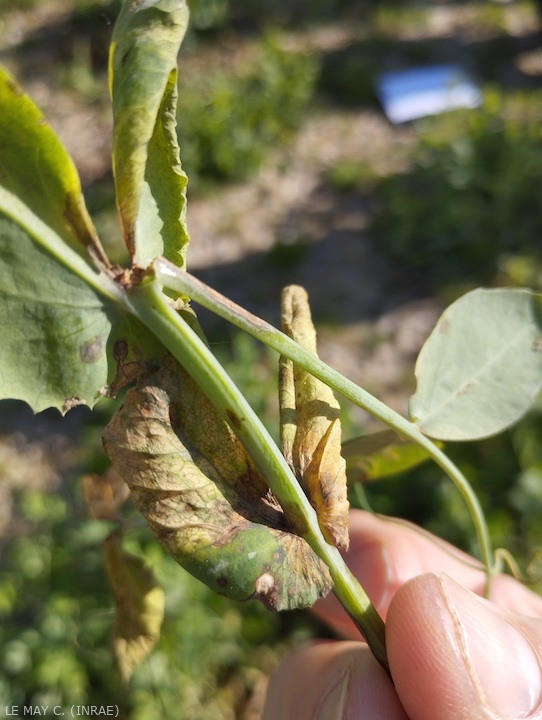Cette maladie est développée par un complexe parasitaire incluant 3 espèces fongiques Didymella pinodes (D. pinodes), Phoma medicaginis var. pinodella (P. pinodella), et Ascochyta pisi (A. pisi). Si les deux premières espèces fongiques (D. pinodes et P. pinodella) développent les mêmes symptômes, à savoir des nécroses évolutives de couleur marrons (Figures 1 à 3), la dernière, A. pisi, développe des symptômes pouvant ressembler à ceux du Colletotrichum.