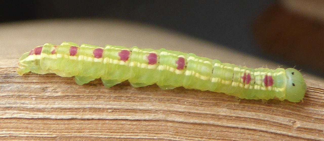 La livrée de la chenille est caractéristique ; elle est vert jaune avec deux lignes longitudinales blanchâtres, bordée de jaune. Sur le dos, présence de taches rougeâtres sur les segments postérieurs pour les derniers stades. Chenille ressemblant à celles des noctuelles, lisse sans protubérance.