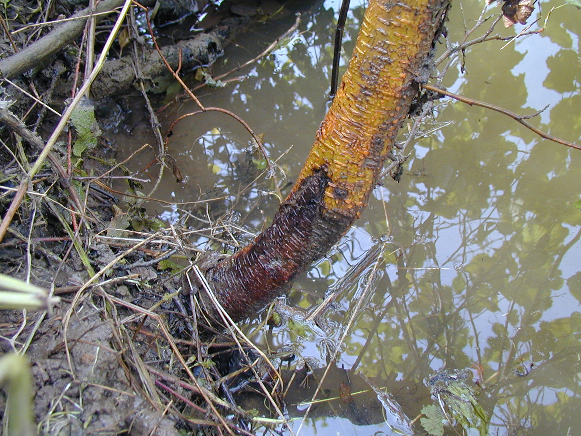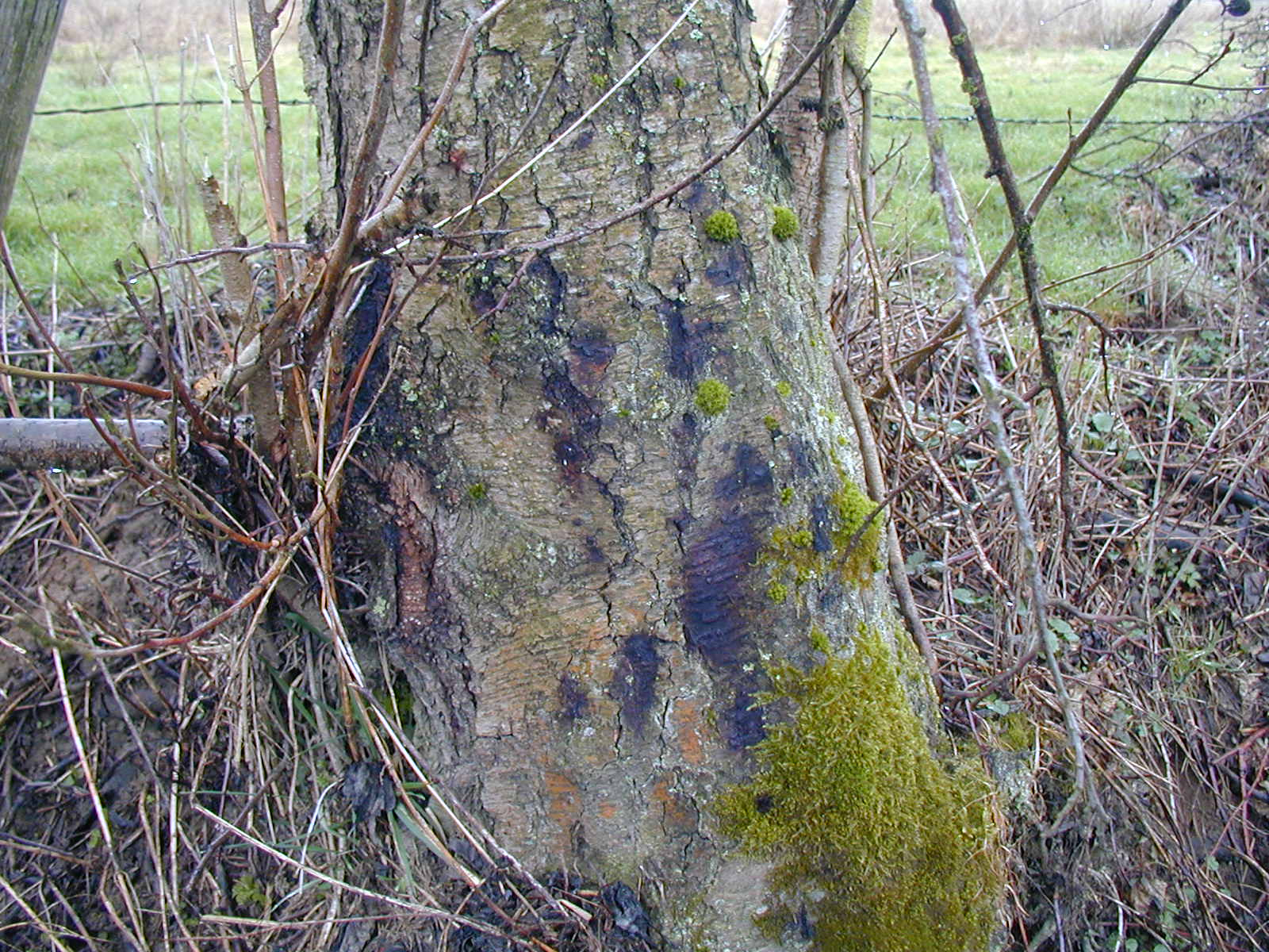 Des blessures mécaniques ou des attaques d'insectes peuvent provoquer des taches suintantes et des coulures. Il est nécessaire de décaper l'écorce sous les taches pour vérifier la présence de lésions sous-corticales en forme de flamme en connexion avec le sol.