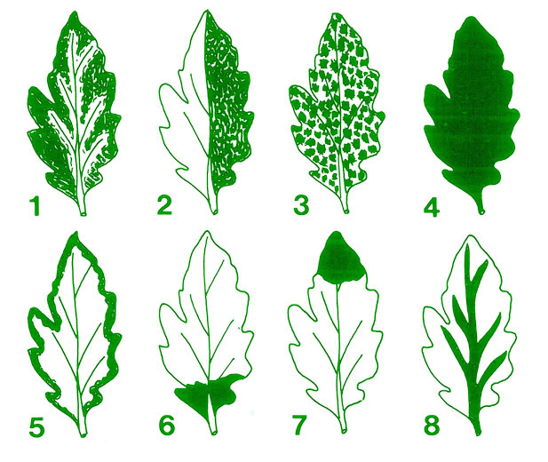 Soulignons que ces affections provoquent aussi et en même temps des modifications de la forme des feuilles. Vous aurez donc intérêt à vous reporter au chapitre traitant des Anomalies de forme des feuilles afin de compléter votre diagnostic.