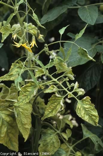 Légère marbrure et une mosaïque plus ou moins marquée sur les folioles. Celles-ci sont parfois filiformes en périodes de faible luminosité (figures 1 et 2). Virus souvent incriminé à la place du ToMV qui est mieux adapté à la tomate.