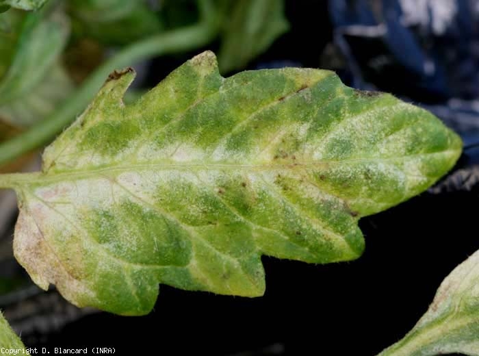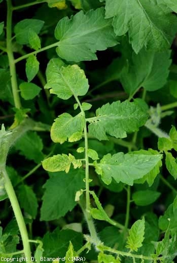 - jaunissement et dessèchement entre les nervures évoluant rapidement ;