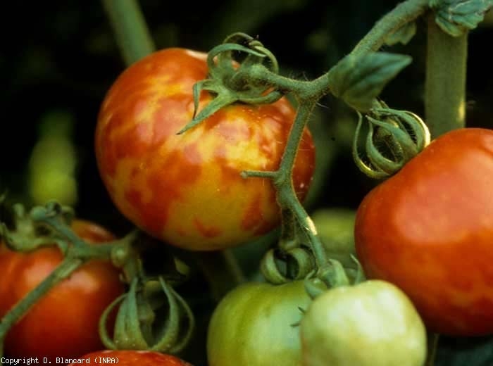 de marbrures et de jaunissements en taches sur fruit de tomate
