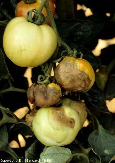 Des lésions nécrotiques brunes, plus ou moins marquées, sont visibles sur les fruits ; ces derniers peuvent aussi être bosselés ( figure 5).