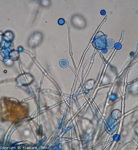 - sous la forme de mycélium à l'intérieur de tubercules de pomme de terre malades restant dans le sol. Lorsque les tubercules contaminés germent, ils donnent naissance à des pousses contaminées sur lesquelles se forment rapidement des fructifications. L'importance de cet inoculum est difficile à estimer. En effet, les souches de P. infestans isolées sur tomate en France sont assez différentes de celles rencontrées sur pomme de terre, confirmant une spécialisation parasitaire des souches. Les souches tomate semblent plus diversifiées et sont capables d'infecter aussi la pomme de terre. On ne peut donc pas exclure la possibilité, même limitée, pour le parasite de changer d'hôte surtout dans les zones de production où la tomate et la pomme de terre cohabitent ;