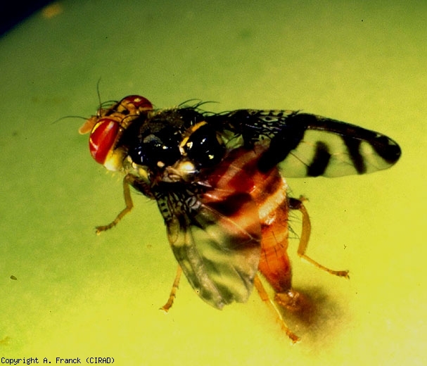 Les accouplements commencent très tôt après l'émergence des adultes (figures 1 et 2) (dès 48 h), et peuvent avoir lieu du matin jusqu'au milieu de l'après-midi, avec un maximum de fréquence en milieu de journée. Comme cher la plupart des autres espèces de Tephritidae, les mâles (figure 3) attirent les femelles (figure 4) en émettant une phéromone sexuelle active à courte distance. La ponte des femelles débute 4 à 6 jours après l'accouplement. A l'aide de leur oviscapte pointu, les femelles déposent leurs oeufs sous l'épiderme du fruit-hôte, à quelques millimètres de profondeur. L'activité de ponte a lieu habituellement I'après-midi, avec un maximum entre 16 et 17 h. Les oeufs éclosent après 3 à 4 jours d'incubation. Les larves s'enfoncent alors dans la pulpe du fruit où le cycle larvaire, qui comprend trois stades, dure de 7 à 11 jours. En fin de développement, les asticots (figure 5) quittent le fruit d'une brusque détente pour s'enfoncer à faible profondeur dans le sol, où s'effectue la nymphose. Le stade pupe dure de 2 à 15 jours. Ainsi, en fonction des conditions climatiques, le cycle complet s'étale sur 26 à 35 jours. Des études sur les stimuli visuels attractifs montrent que les adultes des deux sexes sont attirés préférentiellement par le jaune fluorescent, , alors que les femelles matures sont fortement attirées par des sphères de couleur orange vif. L'étude des stimuli olfactifs attractifs pour les adultes devrait permettre de disposer bientôt d'un piège adapté pour la surveillance des populations.