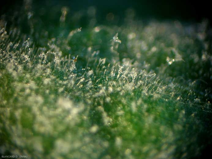 Dans les quelques jours qui suivent les contaminations, de courts conidiophores naissent sur les hyphes secondaires formés à la surface du limbe et produisent les conidies (figure 2). La sporulation est très abondante (figures 3 et 4). Les conidies (figure 5) sont assez fragiles et ne vivent que quelques heures, voire quelques jours, lorsque les conditions leur sont favorables. Elles sont très légères et sont donc facilement transportées et disséminées par le vent, et accessoirement par la pluie ou par les éclaboussures lors d'irrigations par aspersion.