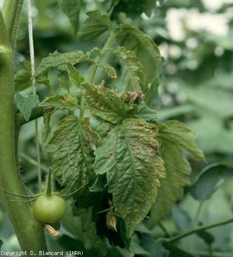 Par la suite, les zones affectées s'étendent et les folioles, plutôt chlorotiques, prennent une teinte bronzée à l'origine du nom de « maladie bronzée de la tomate » (figure 7). Il en est de même pour les taches nécrotiques qui confluent et entraînent la nécrose et le dessèchement de folioles entières. Des lésions nécrotiques (streak) peuvent apparaître sur les pétioles et les tiges. Après plusieurs semaines, les pieds malades peuvent être entièrement nécrosés. Des flétrissements sont parfois observés.