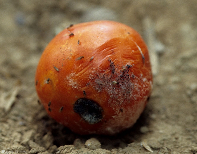 Lésions humides et molles s'étendant rapidement sur les fruits matures essentiellement. Les tissus affectés se liquéfient et finissent par s'effondrer, la cuticule se fend (figure 1). Des écoulements de jus peuvent être constatés. Le mycélium du champignon envahit les tissus, qu'une moisissure blanchâtre à grisâtre recouvre (figures 2 et 3). Cette moisissure est constituée par le mycélium, les sporocystophores et les sporocystes de ce Zygomycète. À terme, de nombreuses fructifications assez aériennes, en « têtes d'épingle noires », se forment sur les tissus lésés (figures 4 et 5).