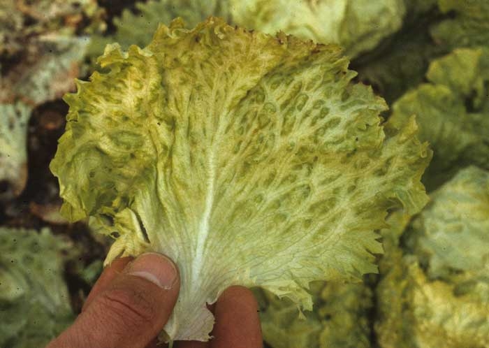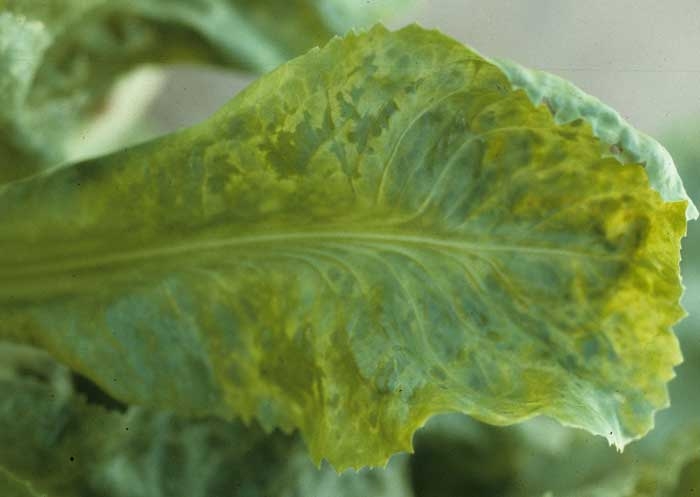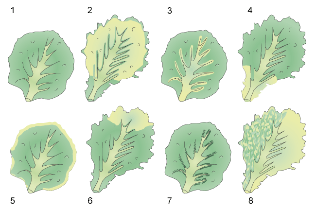 Dans ce contexte symptomatologique, le diagnostic est souvent délicat à réaliser. En effet, de nombreuses maladies, en particulier plusieurs viroses, peuvent être à l'origine de modifications de la coloration des feuilles des salades. Les anomalies les plus fréquemment observées sur les feuilles sont des mosaïques, ou des symptômes apparentés, et des jaunissements (figure 1). Ces anomalies de coloration peuvent revêtir des aspects bien distincts en fonction des maladies, mais être parfois assez similaires pour des affections bien différentes. Cette situation rend très difficile l'identification des maladies (parasitaires ou non) responsables de tels symptômes. Nous vous suggérons donc de consulter attentivement l'ensemble des figures de cette rubrique et de prendre le temps de considérer les différentes causes possibles.