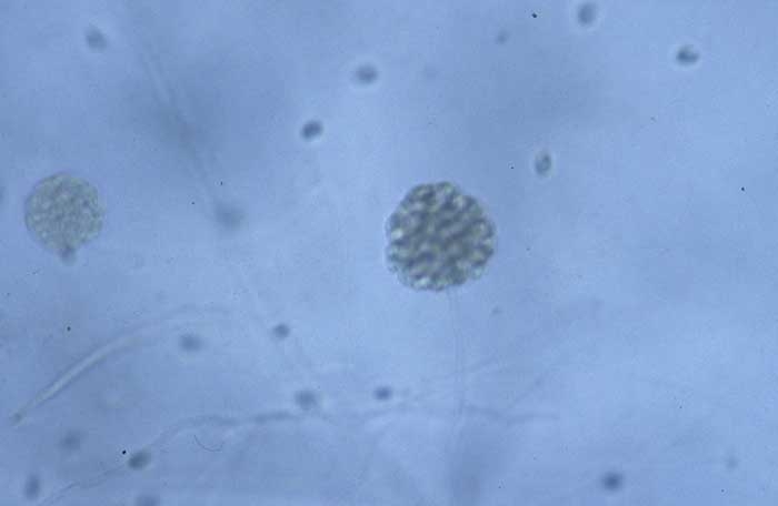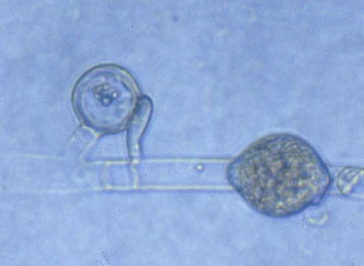 Les Pythium spp. sont capables de vivre à l'état saprophyte aux dépens de la matière organique. Leur faible spécificité parasitaire leur permet d'attaquer un nombre important d'hôtes qui assurent aussi leur multiplication et leur conservation. Phytophthora cryptogea s'attaque à de nombreuses cultures légumières comme le concombre, la tomate, les choux, le céleri, l'asperge, le poivron Phytophthora porri possède un spectre d'hôtes plus limité aux Allium, au chou blanc et à la carotte. Ils se maintiennent dans le sol grâce à des structures de résistance, comme les oospores, les chlamydospores et, à un moindre degré, les sporanges (figures 1 à 4). Chez certaines espèces, les oospores peuvent se conserver de deux à douze années (figures 5 et 6). Les formes de conservation de ces champignons sont stimulées par les exsudats émis par les graines ou les racines. Elles produisent soit un tube germinatif, soit des zoospores.