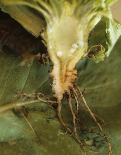 Une coupe longitudinale effectuée dans le pivot de plusieurs laitues malades montre que les vaisseaux sont plus ou moins bruns (figure 3). Dans certains cas, les tissus contigus sont aussi affectés (figure 4). La section longitudinale de plusieurs racines secondaires confirme que le système vasculaire est entièrement touché, étant donné son brunissement marqué.