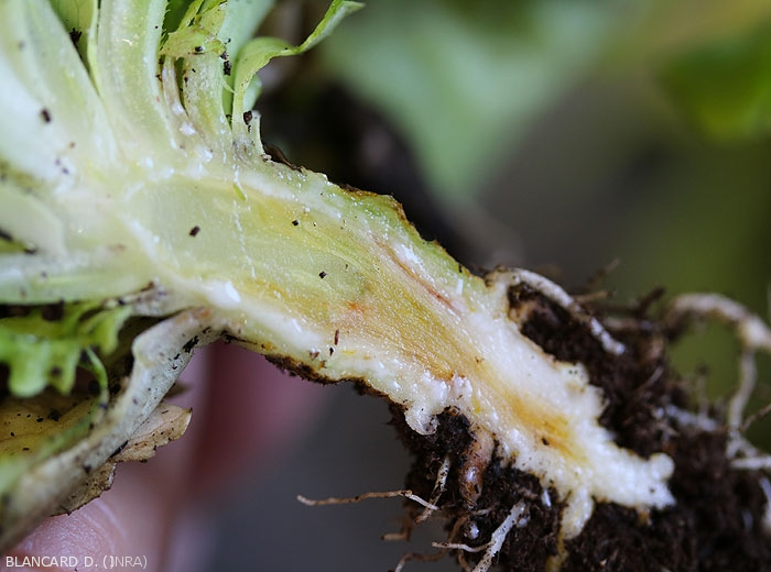 Les plantes adultes affectées montrent des symptômes racinaires et vasculaires comparables à ceux observés sur les plantules. Une coupe longitudinale révèle des vaisseaux de couleur brune (figures 2 à 4). En conséquence, des feuilles situées sur un côté des salades jaunissent et se nécrosent en périphérie du limbe.