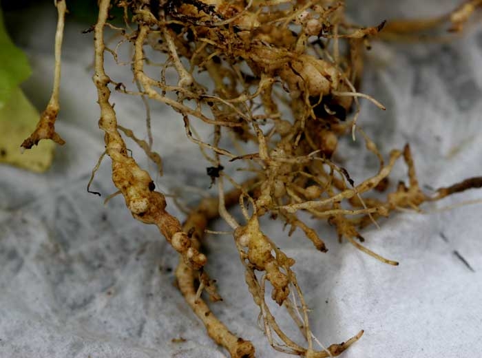 Des galles plus ou moins grosses et régulières sur les racines caractérisent la présence des Meloidogyne spp. (figures 1 à 8). La nature et l'importance des galles dépendent de l'espèce et du taux d'inoculum du sol de ces nématodes (figure 4). Les galles produites par M. hapla sont plutôt petites car il envahit les méristèmes apicaux et affectent donc une plus faible proportion des racines, tandis que celles induites par M. arenaria ont la taille d'une perle et touche la quasi-totalité des racines. Les deux autres espèces majeures entraînent des galles de grande taille couvrant parfois l'ensemble des systèmes racinaires.