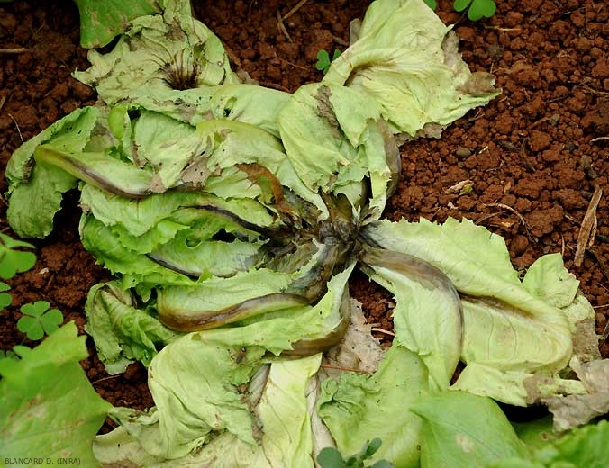 Quelques taches sombres sont parfois visibles sur les feuilles. Par la suite, une pourriture humide, visqueuse, brun foncé à noire s'initie sur quelques feuilles puis gagne l'ensemble de la pomme ("slime head") (figure 5). A terme, les salades touchées peuvent se liquéfier complètement (figure 6). Aucune structure particulière n'est observée sur les tissus contrairement aux champignons parasites responsables de flétrissement et de pourritures foliaires (Botrytis cinerea, Sclerotinia spp.).