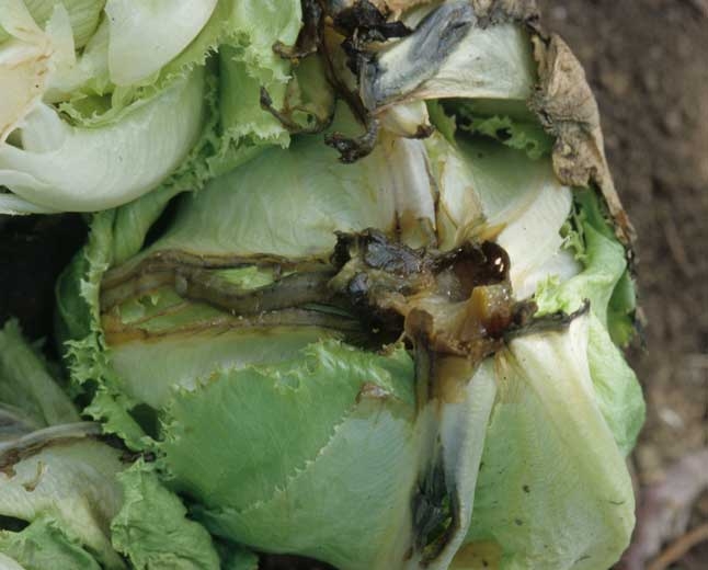 Comme vous pouvez le constater sur les figures 1 et 2, la maladie des anneaux nécrotiques de la salade et l'anthracnose, respectivement provoquées par l'agent des anneaux nécrotiques de la laitue (LRNA) et Microdochium panattonianum, sont à l'origine de taches et de nécroses qui couvrent parfois de larges secteurs sur les feuilles basses des salades. Leurs symptômes peuvent parfois prêter à confusion avec ceux engendrés par les agents pathogènes traités dans cette rubrique. Il en est de même pour Pectobacterium carotovorum subsp. carotovorum (figure 3) dont la pourriture interne de la tige des salades peut gagner les nervures des feuilles basses et déborder sur le limbe environnant, contribuant ainsi à quelques confusions.