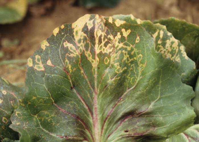 Le virus de la mosaïque de la luzerne (Alfalfa mosaic virus, AMV) est responsable de mosaïques jaune vif sur salades, parfois dénommées mosaïques "calico" (figure 1). Ainsi, on observe des anneaux et/ou des taches, de couleur jaune à blanche, sur les feuilles de la jupe (figures 2 à 4). Des jaunissements, puis des blanchiments s'initient parfois à proximité des plus grosses nervures et s'étendent. Il s'agit de taches souvent irrégulières et de taille réduite. Ces décolorations n'affectent en aucun cas l'ensemble du limbe. Ces symptômes sont bien différents de ceux occasionnés par le TuMV et les jaunisses virales (BWYV, BPYV) ; le diagnostic de cette virose ne pose normalement pas de problème.