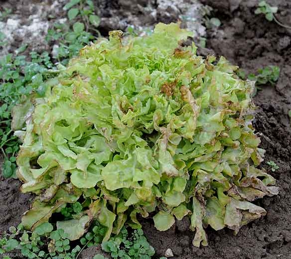 Par ailleurs, lors de très basses températures, en dessous de 0 °C, les salades peuvent peuvent geler plus ou moins en fonction des types et des variétés de salades. Lorsque les température redeviennent plus clémentes, celles qui sont  trop affectées flétrissent et s'effondrent, donnant l'impression aux tissus folaires d'avoir été ébouillantés (figures 6 à 8). L'intérieur du pivot peut également être touché, montrant des lésion nécrotiques internes (figure 9).