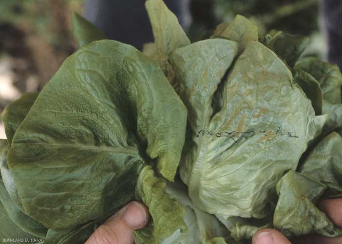 Les tissus tendres et succulents de certaines salades supportent mal les basses températures. A la suite de gelées, il n'est pas rare de voir apparaître des lésions internervaires allongées correspondant à la formation de glace sous l'épiderme. La face supérieure du limbe peut être ridée, cloquée (figure 1). Sous le limbe, l'épiderme se décolle des tissus sous-jacents ; les portions atteintes du limbe prennent alors une apparence argentée. Assez fréquemment, l'épiderme rompt et les tissus du mésophylle, plus protégés, acquièrent une coloration orangée à brune (figures 2 à 4). Des éclatements tissulaires peuvent survenir le long de la nervure principale (figure 5).