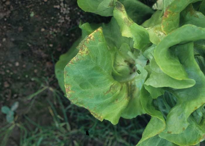 Les premiers symptômes de la maladie des taches orangées, causés par l'agent des anneaux nécrotiques de la laitue (Lettuce ring necrosis agent, LRNA), peuvent survenir à la périphérie de certaines feuilles de la couronne. Ainsi, une portion plus ou moins importante des tissus situés à la bordure du limbe deviennent translucides, huileux, brunissent et se nécrosent progressivement (figures 1 et 2). Dans certains cas, la nervure principale peut également être touchée ; elle présente alors, plus ou moins localement, une teinte orangée à brun rouille assez caractéristique.