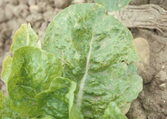 Au champ, où les attaques sont les plus destructives, les laitues apparaissent rabougries et parfois fortement nécrosées. Les feuilles sont plus étroites, légèrement enroulées ou distordues (figure 1). Les jeunes feuilles montrent de temps à autres des altérations nécrotiques, plus ou moins limitées et situées à proximité ou non des nervures (figure 2). On peut aussi observer des anneaux. Des taches chlorotiques sont visibles sur certains étages foliaires (figure 3). De fines nécroses apparaissent parfois, conférant au limbe un aspect légèrement "bronzé". La sévérité des symptômes est d'autant plus grande que le stade de l'infection a été précoce. On peut également constater des éclaircissements nervaires, une mosaïque plus ou moins marquée (figure 4), des taches nécrotiques...