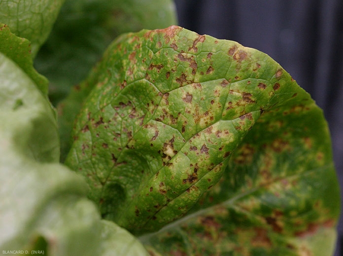 Sur les laitues beurre, des plages jaunes, punctiformes ou anguleuses, apparaissent dans un premier temps, conférant parfois à la face supérieure de la feuille un aspect persillé (figures 7 à 11). Des anneaux, des taches orangées peuvent également se développer.