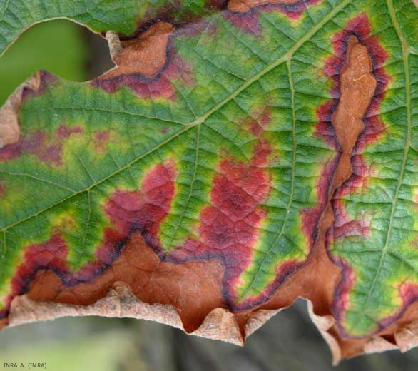 - Une forme lente caractérisée par des décolorations variables des feuilles, le limbe prenant une teinte jaune ou rouge sur cépage blancs, et jaune sur cépages noirs (figures 3 à 5). Ces décolorations peuvent être accompagnées de lésions foliaires nécrotiques formant des digitations inter-nervaires à l'origine de l'aspect tigré des feuilles. Si ces dernières sont fortement affectées, elles peuvent se dessécher entièrement et se détacher des rameaux.