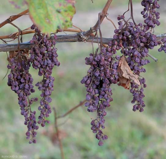 Les baies présentent parfois un retard de maturité, ou flétrissent (figure 6), ou encore présentent des petites taches brunes ou violacées à leur surface. - Une forme foudroyante ou apoplectique à l'origine du flétrissement et du dessèchement soudain et total de toutes les feuilles des ceps malades et conduisant à leur mort (figure 7). Soulignons que cet événement se produit souvent au cours de l'été après une période pluvieuse suivie de forte chaleur.