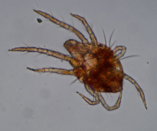 La larve est de couleur rouge à orange vif. Le premier stade larvaire est hexapode alors que les suivants sont octopodes. Les stades de mue sont de couleur rouge plus ou moins vif.
