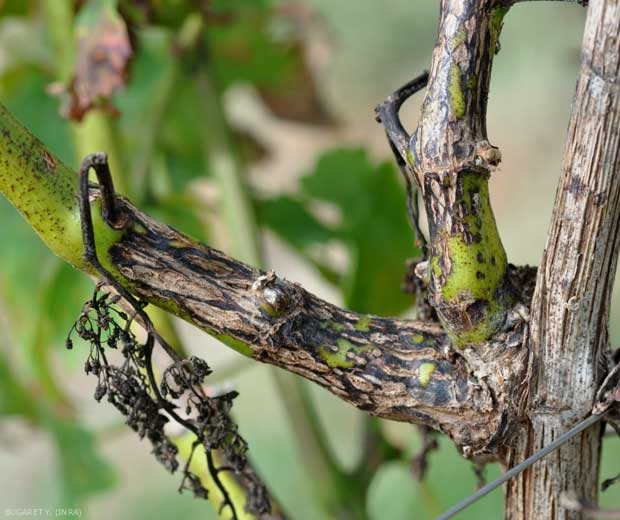 Des lésions apparaissent sur les premiers entre-noeuds de la base des jeunes pousses, souvent en niveau des lenticelles. Elles sont de taille limitée, de forme allongée, et de couleur sombre dans un premier temps (figure 1) ; elles brunissent et noircissent par la suite montrant des reflets bleuâtres (figure 2). Ces lésions nécrotiques deviennent fréquemment chancreuses, les tissus centraux du cortex s'éclaircissant et se fissurant plus ou moins en largeur (figures 3 à 7). Ce dernier phénomène est amplifié en période de croissance rapide de la vigne. Des lésions similaires peuvent être observées sur les pétioles et les pédoncules des inflorescences et des grappes. Celles-ci peuvent conduire au dépérissement de la grappe, qui n'est alors plus alimentée, ou faiblement (figure 8).