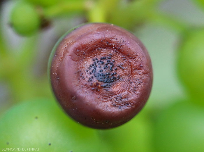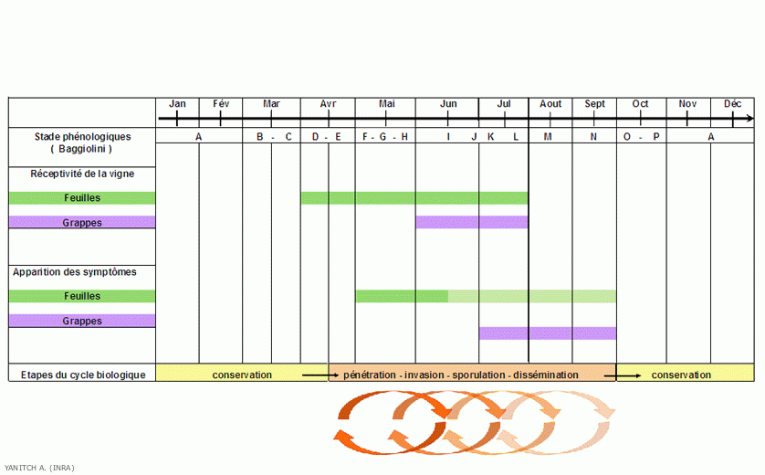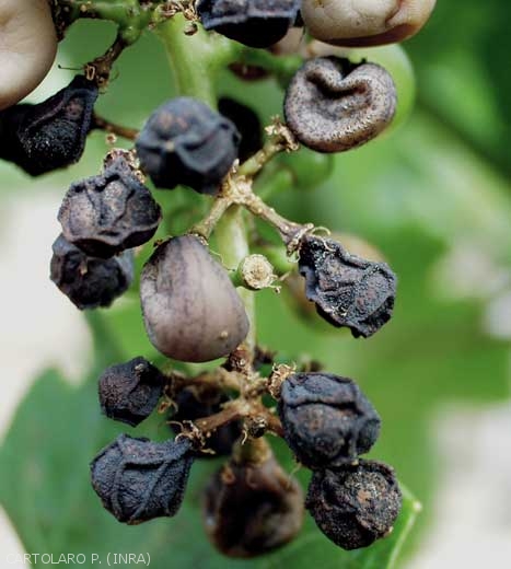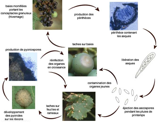 La grappe est très vulnérable du stade floraison jusqu'au stade fermeture de la grappe ; par la suite sa sensibilité diminue progressivement jusqu'à la véraison. Précisons qu'aucune infection ne serait possible avant la chute des capuchons floraux ; le maximum de sensibilité serait atteint dans les deux à trois semaines qui suivent ce stade. Ajoutons que les symptômes obtenus par contaminations artificielles, à partir d'ascospores ou de pycniospores, sont identiques en conditions favorables de température et d'humidité.