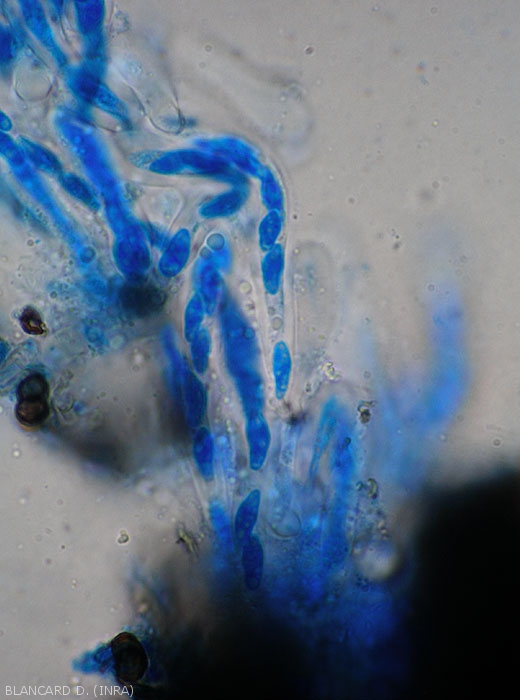Par la suite, des ponctuations brunes à noires apparaissent sur les tissus altérés, ce sont les pycnides qui se forment progressivement (figures 6 et 7). Elles contiennent des conidies (figure 8) qui assureront des contaminations secondaires surtout sur les jeunes baies situées en dessous. G. bidwellii produit également d'autres structures globulaires, mais plus petites : les spermogonies. Celles-ci forment des conidies ou spermaties en forme de bâtonnet qui révèlent quelques difficultés pour germer et dont le rôle épidémiologique n'est pas clairement défini. Notons que de nouvelles contaminations pourront être initiées par des ascospores ou des conidies. Les ébauches des périthèces se formeraient plutôt en fin de saison à partir des pycnides déjà formées et vides.
