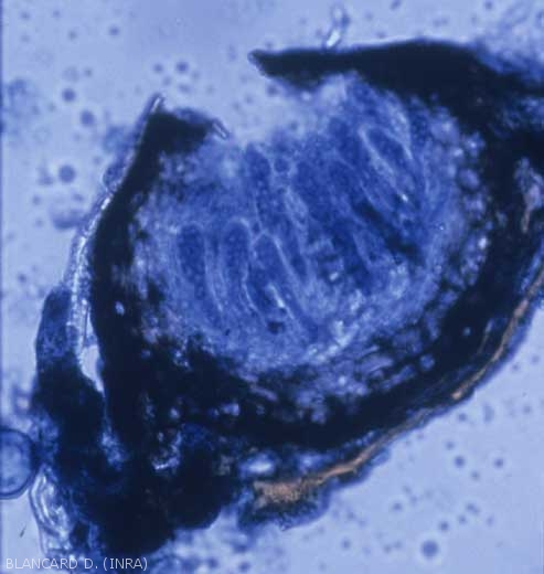 Les pycnides peuvent parfois constituer une forme de conservation hivernale (figures 4 et 5). Rappelons que le déchaussage au printemps peut ramener à la surface du sol des baies momifiées enfouies lors du labour d'automne et donc faire remonter un inoculum potentiel. Ajoutons que les vignes abandonnées permettent à G. bidwellii de se multiplier et se conserver ; elles maintiennent en permanence un inoculum potentiel à proximité des parcelles cultivées.