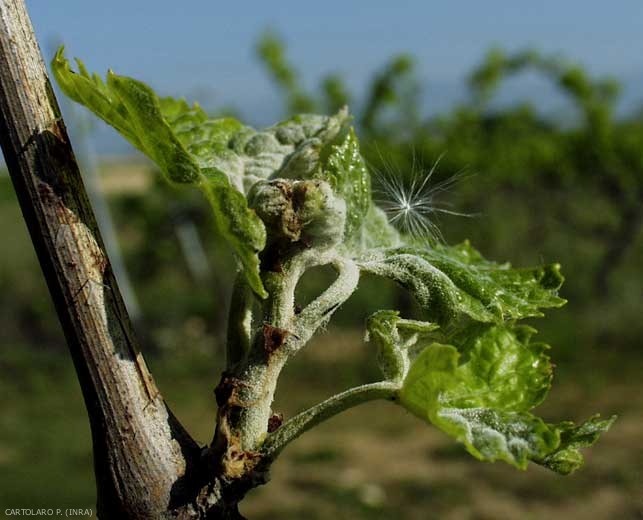 - du mycélium dormant, présent dans les bourgeons, se réactivant dès que la température devient plus clémente. Par la suite, il se propage à la surface des organes, et émet des hyphes spécialisés qui pénètrent dans les cellules épidermiques après avoir percé la cuticule et la paroi des cellules végétales. Ces suçoirs (appelés haustoria) permettent à E. necator, une fois parvenu dans les cellules, de prélever les aliments nécessaires à sa croissance. En présence d'un tel inoculum primaire, des symptômes d'oïdium de type "drapeau" se manifesteront par la suite (figure 3) ;
