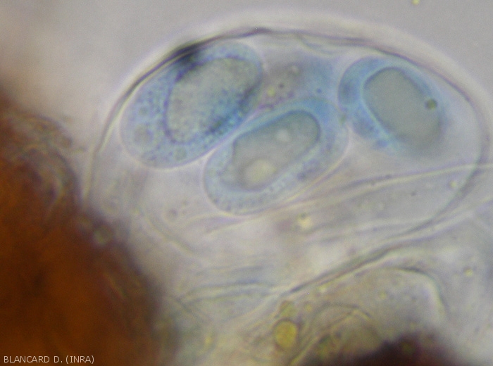 - des ascospores issues de cléistothèces matures et déhiscents (figures 4 et 5). Celles-ci germent une fois présentes sur un organe et initient des contaminations primaires (figure 6). Par la suite, plusieurs filaments mycéliens ramifiés se développent ainsi que des haustoria à intervalles réguliers, ce qui permet au champignon de coloniser superficiellement les tissus et de vivre à leurs dépends.