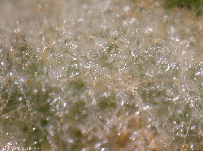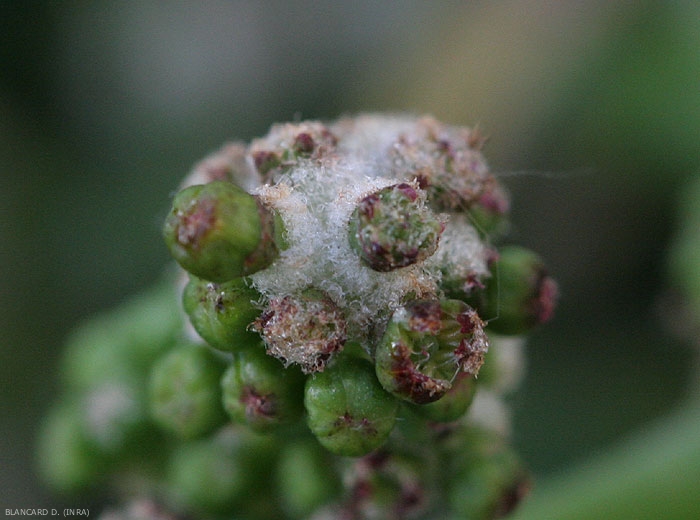 Les pétioles, les vrilles ou les boutons floraux (figures 8 et 9) peuvent également révéler la prolifération de poils hypertrophiés. Le duvet plutôt dense formé est initialement blanc, puis prend une teinte rosée plus ou moins prononcée selon les cépages, voire brune à rouge à terme. Ces zones pilifères sont dues au développement des cellules de l'épiderme suite aux piqûres nutritionnelles des Phytoptes qui se protègent à l'intérieur de ces réseaux de poils hypertrophiés. En cas de fortes attaques, des feuilles entières peuvent être boursouflées et recouvertes d'un duvet blanchâtre à leur face inférieure.