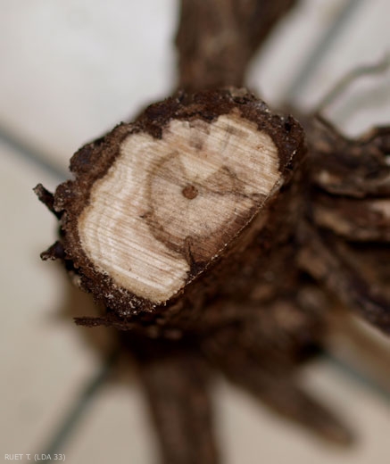 - Des coupes transversales réalisées dans la partie nécrosée du porte-greffe montrent une ou plusieurs lésions nécrotiques brunâtres dans le bois évoluant de l'écorce vers la moelle (figures 5 à 8). Des coupes longitudinales permettent d'observer qu'elles ont une longueur variable et qu'elles suivent les vaisseaux du bois. Des phénomènes de tylose peuvent accompagner ces symptômes.