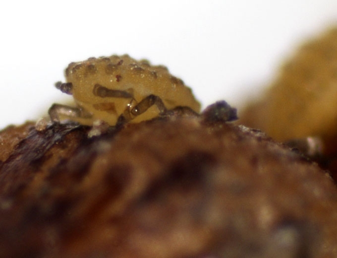 - Les larves radicicoles s'installent sur le système racinaire d'autant mieux que le sol est riche en argile. Les larves se fixent sur la racine et se développent jusqu'au stade adulte, stade durant lequel la femelle pondra une centaine d'oeufs. La quantité d'oeufs pondus diminuera par la suite au fur et à mesure des générations. On compte de 6 à 7 générations de radicicoles en France en général. Progressivement, une partie des larves migre vers la surface du sol pour coloniser le feuillage, soit directement, soit par diffusion éolienne.