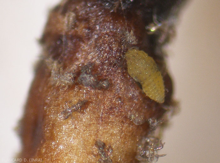 - Le cycle épigé se déroule sur les organes aériens de la vigne, en particulier sur les organes non lignifiés du végétal. Les fondatrices éclosent des oeufs d'hiver au début du printemps. Elles colonisent les feuilles apicales via leur face supérieure et la bordure du limbe, et forment des galles. Le premier stade larvaire est mobile, de couleur jaune clair et de forme conique. Pendant toute la durée de sa vie, la fondatrice va pondre de 550 à 600 oeufs jaunes (figure 1) présentant une surface lisse ou réticulée.